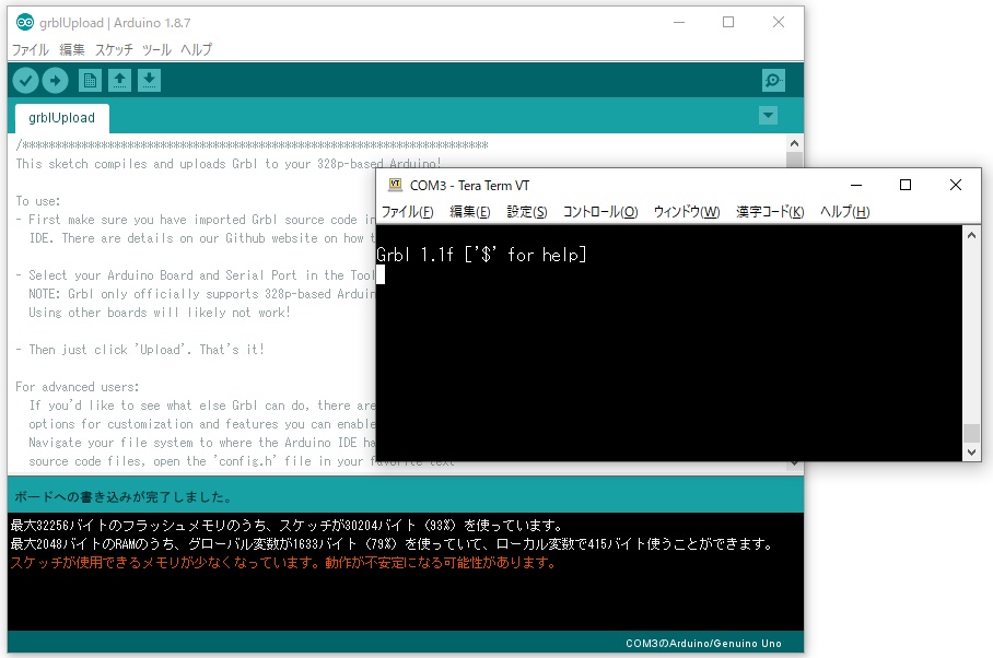 上記サイトから Grbl をダウンロードして Arduino-IDE でビルド&書き込みを行います。今回使用したバージョンは 1.1f です。