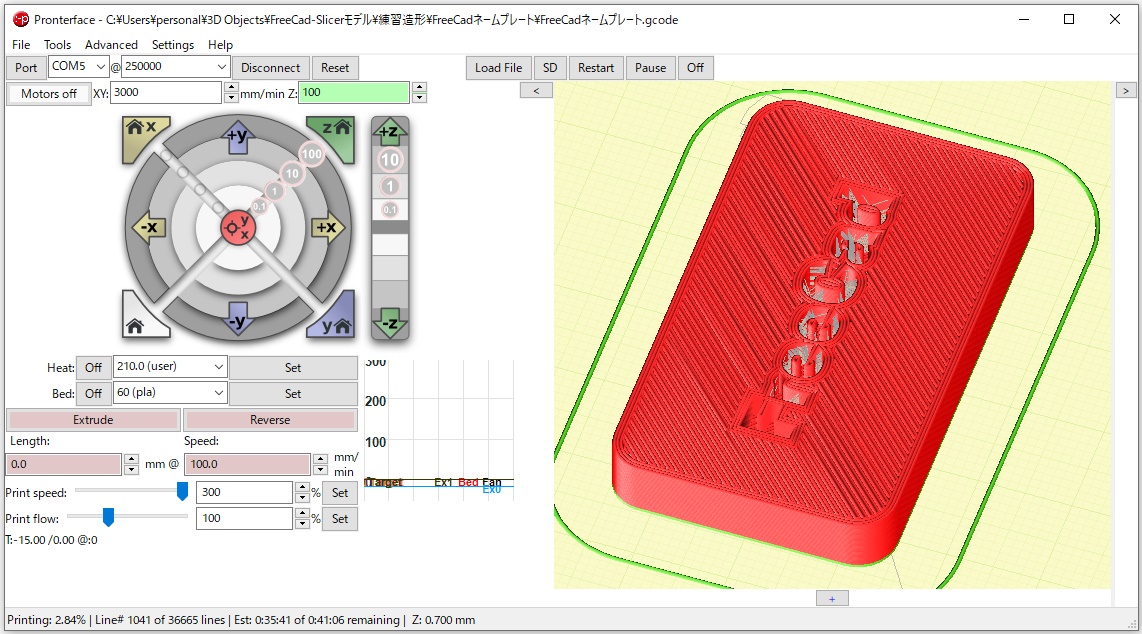 3. G-CODEセンダーを使って3Dプリンタに G-CODE を送信し3Dプリンタを動かし実際に造形物を作り上げる。