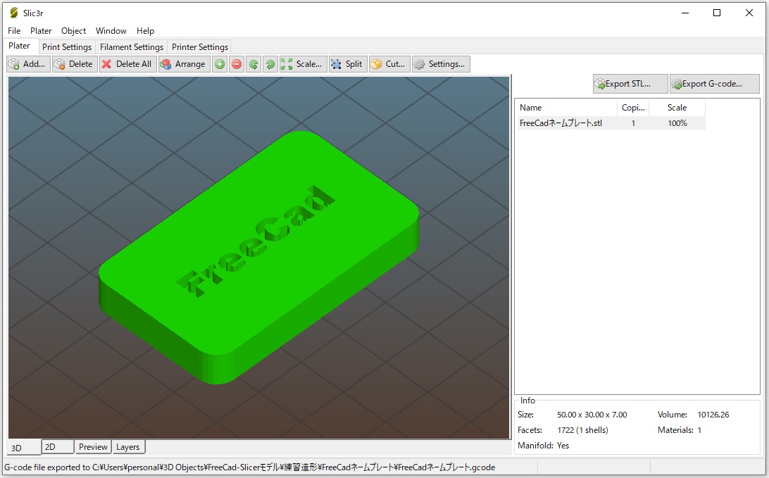 今回はいろいろ調べた結果、次の組み合わせで1連の作成工程を行ってみました。実際に行ってみると各工程(3DCAD、スライサー)で目には見えない技術的ノウハウが必要であることも感じえませんでした。3DCADで出力したファイルをスライサーで読み込んで G-CODE を生成すればうまくいくかと思えばそうは簡単ではないようです。細かい加工については最終的には G-CODE を直接追加、変更する必要があるなぁと感じました。