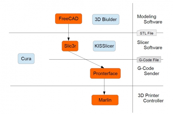 オープンソースにおいては 3DCAD、 スライサー 、 G-CODEセンダー、ひいては 3Dプリンタを制御するプログラムは個別に開発されているものをネットで検索するなどして各人が見つけ出し、使いやすさや、入出力ファイル形式の関連性等を調査し使用することになります。