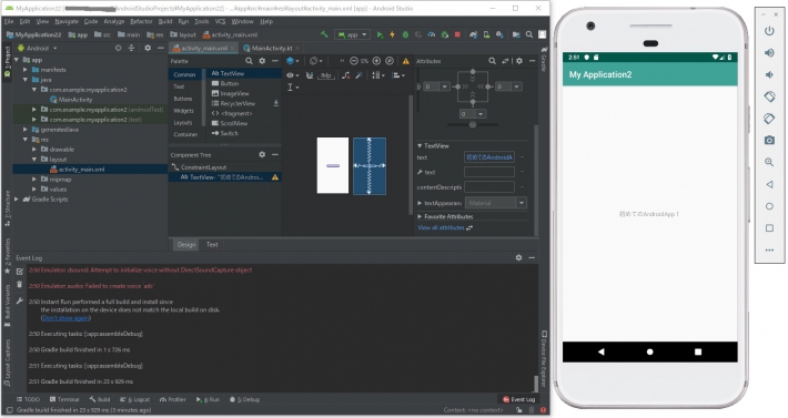以下のような感じで仮想Android端末でAndroidアプリを動作させることができました。「Hello World」文字列を 「初めてのAndroidApp!」に変えています。