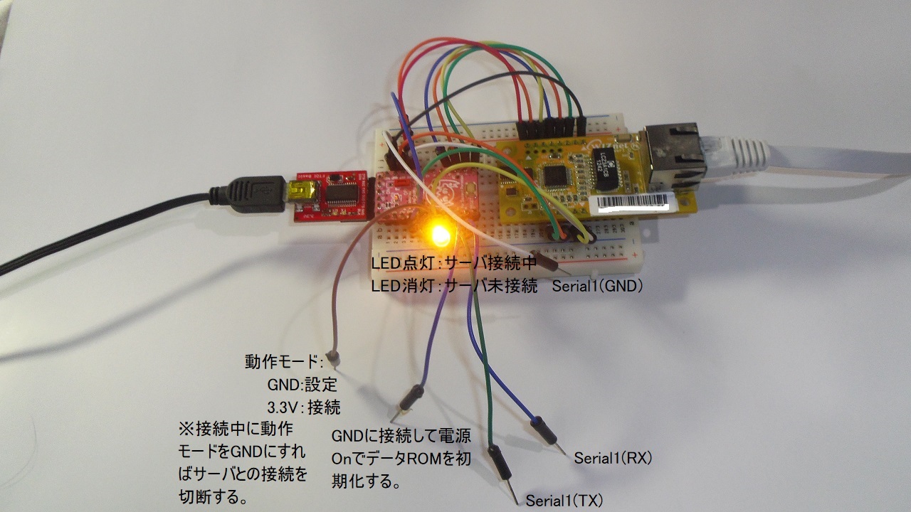 上の接続図のマイコンとの接続のところを TTLシリアル-USBシリアル変換器を使ってPCに接続した場合はこんな感じとなります。
