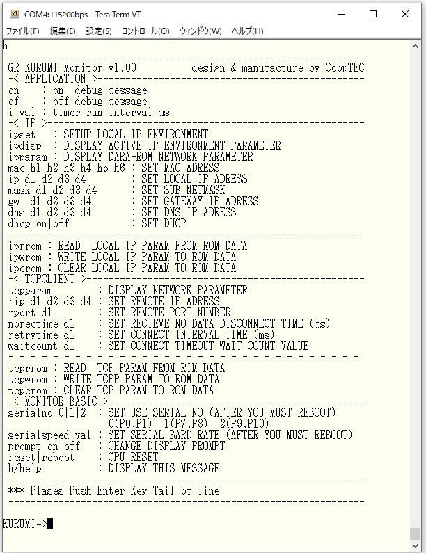 AスイッチをHi/LowすることによりTCPサーバへの接続・切断を行います。接続先のTCPサーバのIPアドレスは事前に設定コマンドで行うことになります。AスイッチをLowにしているときはSerialまたはSerial1にTeraTerm等のターミナルソフトを繋げて次のような項目の設定を行えます。