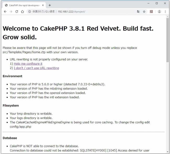 apacheの設定がちゃんとされていないと上記のcakePHPのページがちゃんと表示されないので気を付けましょう。次のような画面が表示されるのでその時はapacheの設定を変更してみてください。