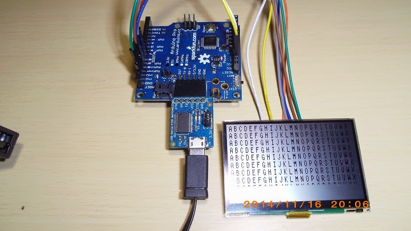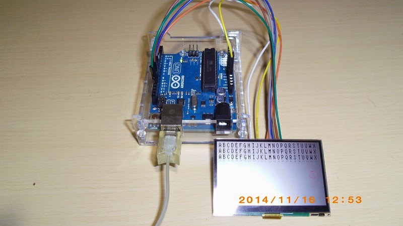 とりあえず、日本語表示はArduinoのメモリが少ないので無理なのでASCIIコードのアルファベットが表示できるとこまでやってみました。