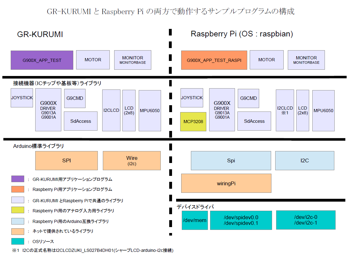Raspberry Pi とGR-KURUMIで動かしているプログラムは単一のソースファイルをビルドできるように工夫して作成しております。 SPIやi2c(Wire)はArduino互換のRaspberryPi用のライブラリを作成して対応しております。一部互換性を保てない特殊なケース(i2cの拡張機能)もありますが、注意してアプリを作成すれば問題ない範囲だと思います。