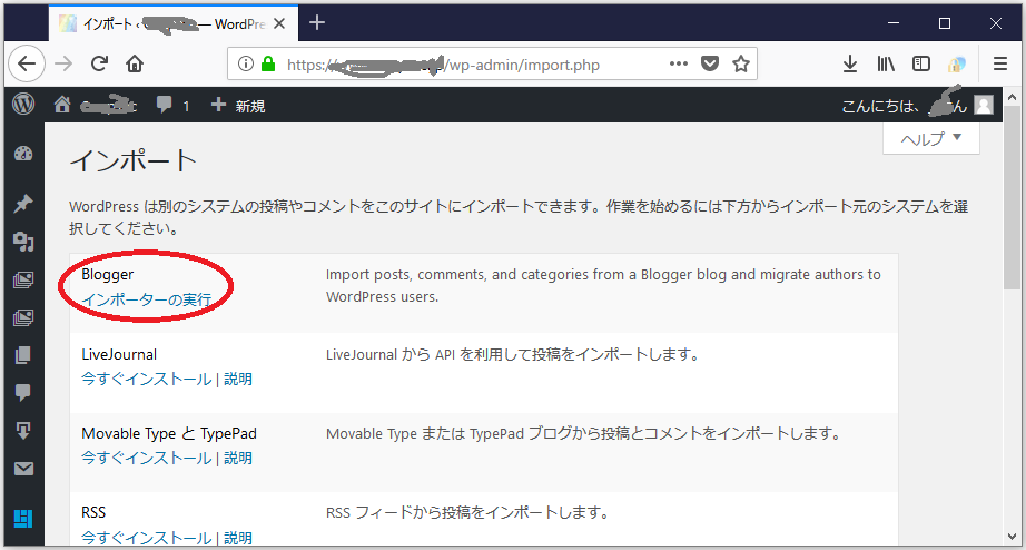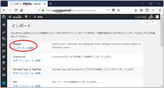 2. wordpressにログインし、ツール->インポート->bloggerの「今すぐインストール」をクリックしその後「インポーターの実行」をクリックする。
