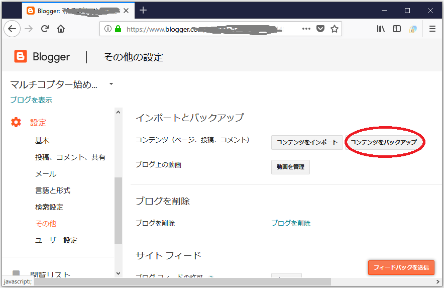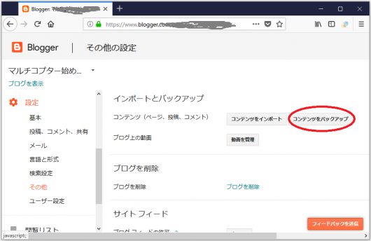 1. blogger(blogspot.com)にログインし、投稿のバックアップ(xml)ファイルをPCに保存する。